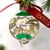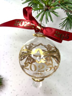 Our superb classic collector’s bauble with the Year 2025 hand stencilled in gold onto this lovely Victorian inspired bauble. Complete with matching 2025 red satin ribbon. Perfect to remember this year and special occasions. Limited Edition.