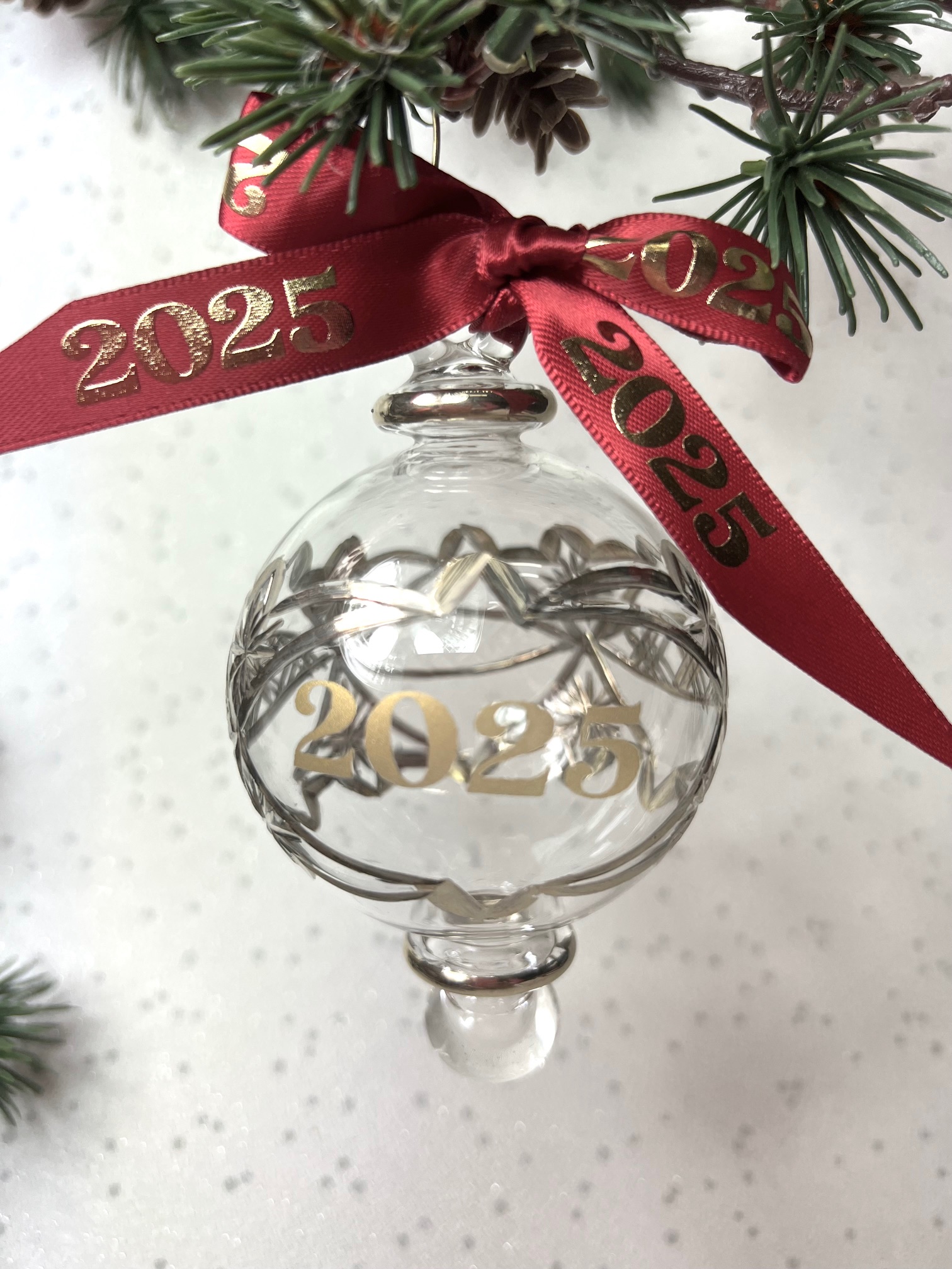 Our superb classic collector’s bauble with the Year 2025 hand stencilled in gold onto this lovely Victorian inspired bauble. Complete with matching 2025 red satin ribbon. Perfect to remember this year and special occasions. Limited Edition.