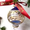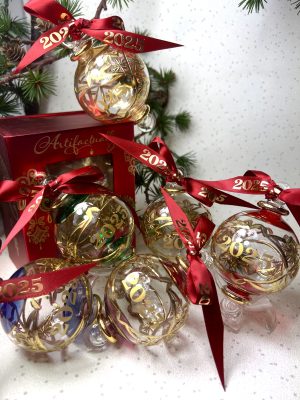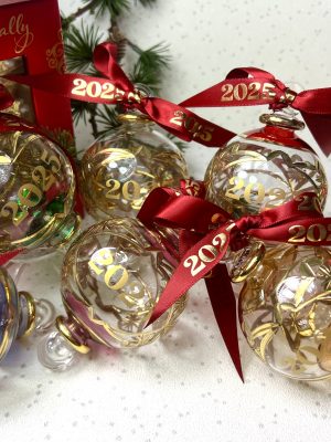 Our superb classic collector’s bauble with the Year 2025 hand stencilled in gold onto this lovely Victorian inspired bauble. Complete with matching 2025 red satin ribbon. Perfect to remember this year and special occasions. Limited Edition.