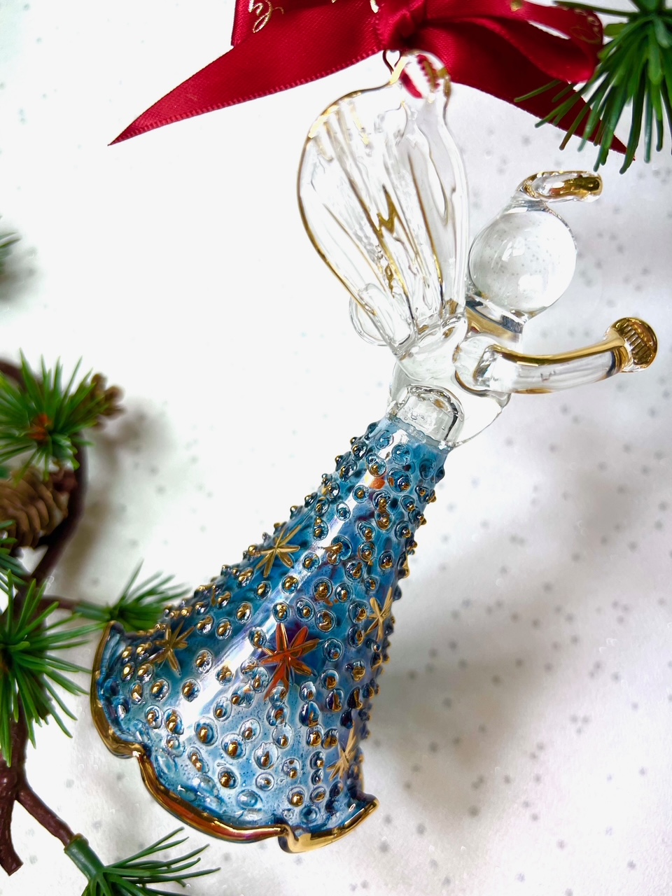 Hanging or standing our gorgeous mouth blown angel is covered in a multitude of individually applied raised glass dots around hand etched stars. In silver trim (with silver stars & silver dots) or gold trim (with gold stars & gold dots). And now the gold version comes with a variety of skirt colours to choose from. So angelic on your Christmas Tree or hanging in a window. Size L (6cm x 12cm)