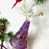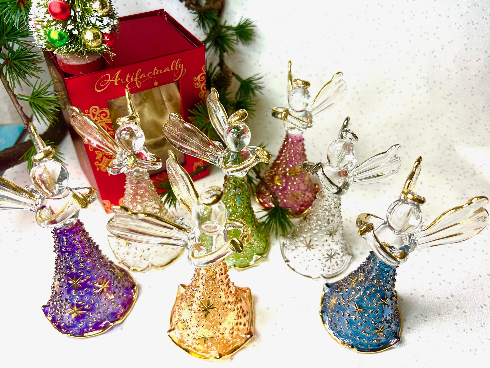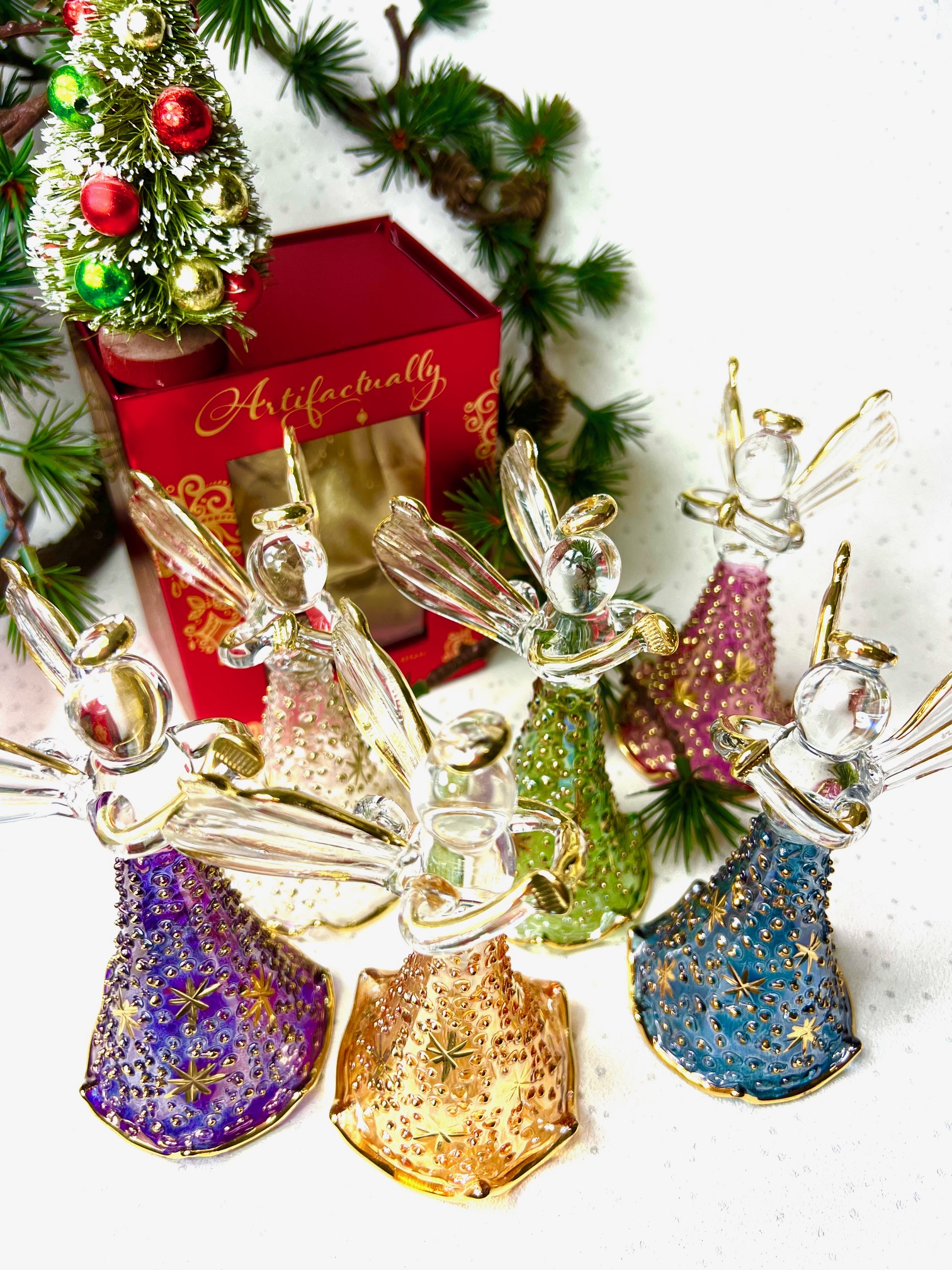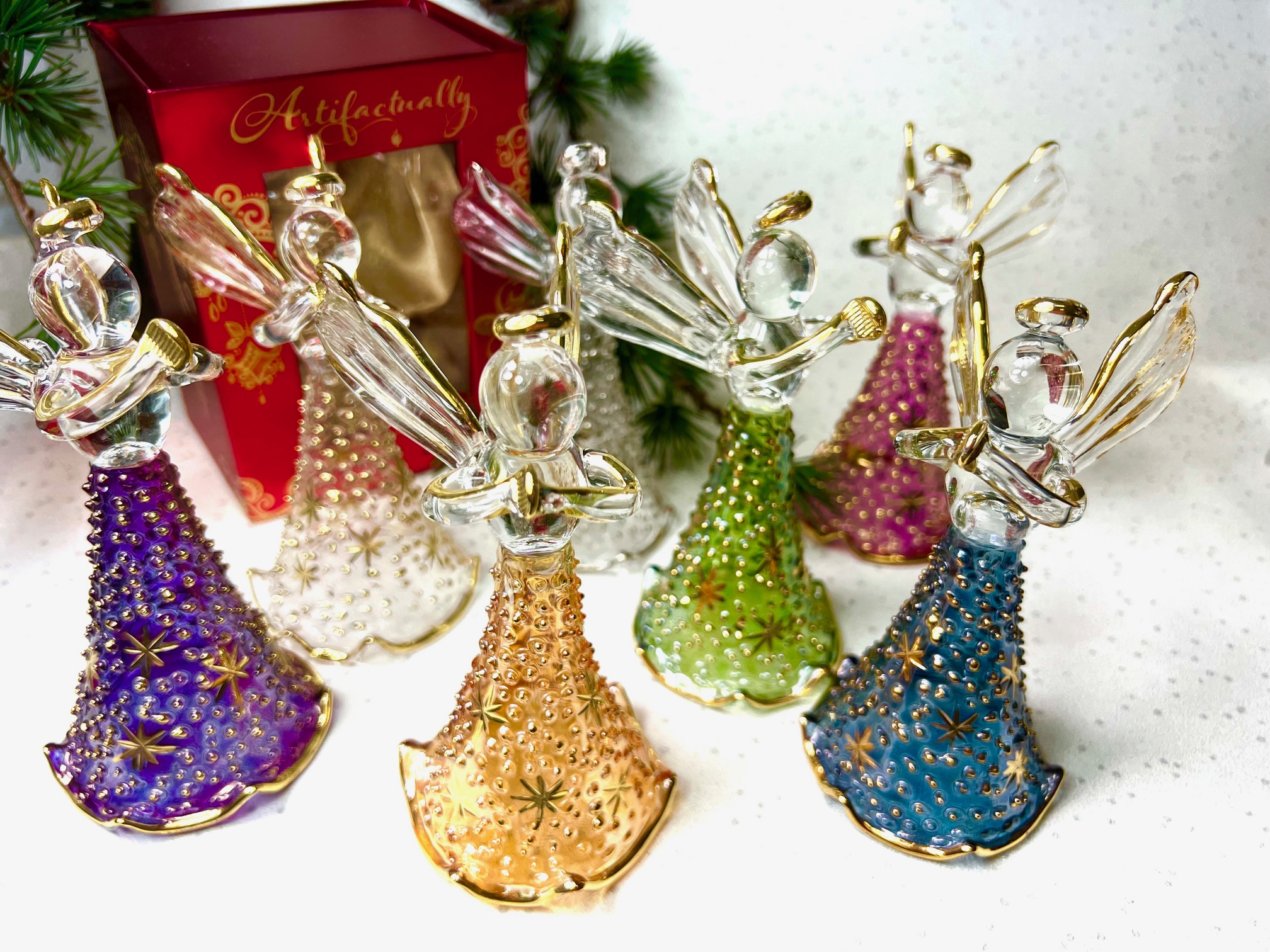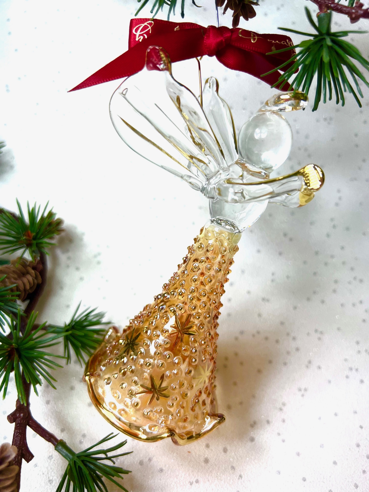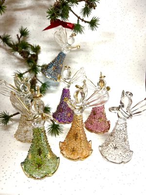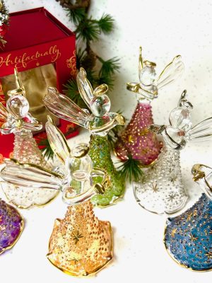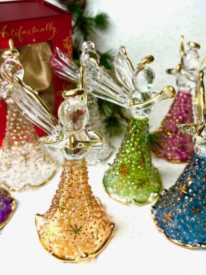 Hanging or standing our gorgeous mouth blown angel is covered in a multitude of individually applied raised glass dots around hand etched stars. In silver trim (with silver stars & silver dots) or gold trim (with gold stars & gold dots). And now the gold version comes with a variety of skirt colours to choose from. So angelic on your Christmas Tree or hanging in a window. Size L (6cm x 12cm)