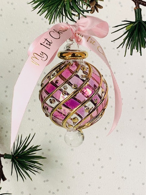A classic handblown glass Baby Ornament with mini raised glass dots and diagonal stripes. The perfect gift and keepsake for a new little one this year.