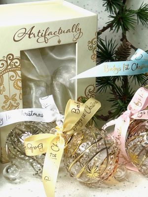 The prettiest bauble in town……gloriously hand etched with 3 pretty stars and a multitude of individually applied tiny raised glass dots. With matching ribbon, metal year charm and keepsake box. A lovely gift……….
