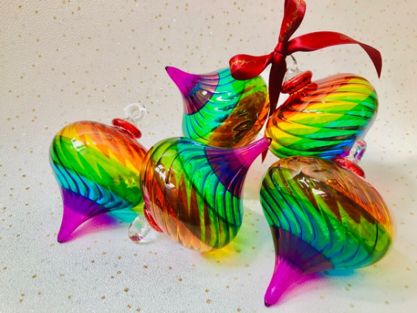 This vibrant Christmas tree ornament is handblown from our diagonal swirl glass and hand painted with horizontal stripes of all the colours of the rainbow. A unique shape is certain to stand out on your tree this year. Size M – (7cm x 8cm)