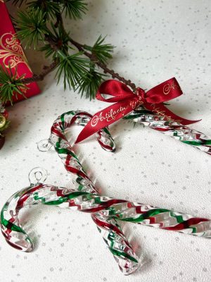 Our cheerful glass Candy Cane ornament will add some whimsy to your Christmas Tree. Handmade from a hollow glass tube with red and glittery white glass stripes. Just wonderful and calorie free! Also available in Red/White.