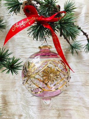 A gorgeous and feminine bauble covered with hand etched daisies and leaves hand painted in sparkling gold. Too pretty just for the Christmas Tree, try them hanging from your lights in your home or in the window.