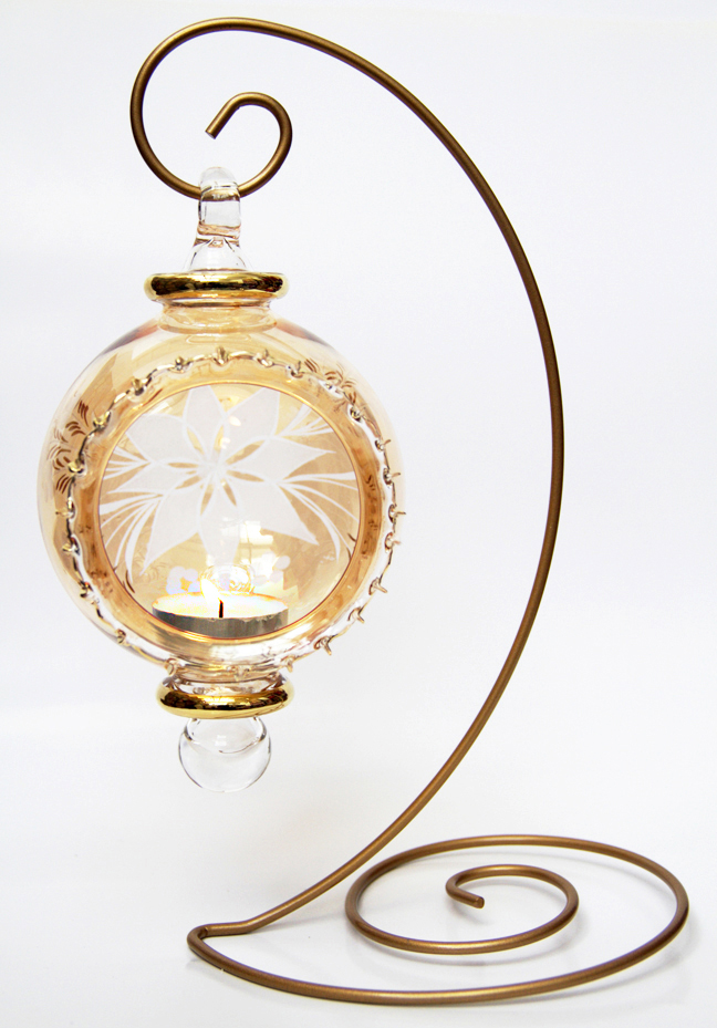 So pretty hanging on its metal stand – from a beam or a ribbon in your home. The delicate glass etch work really stands out when the candle is lit. A gorgeous gift for someone to treasure. Metal display stand sold separately.