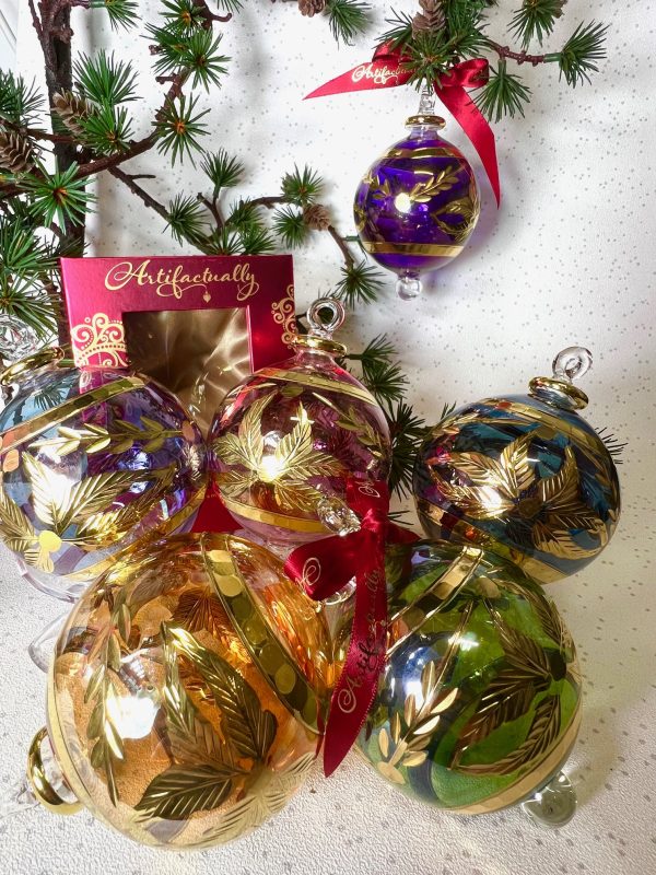 An ornate bauble with a gorgeous hand etched feather design and hammered patterned border. Very elegant on the Christmas Tree.