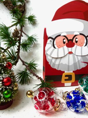 A gorgeous XS bauble (3cm x 5cm) inside a cute Santa Gift Box (9cm x 13cm) nestled in coloured raffia.