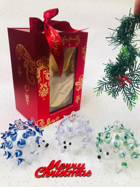 A new addition to our classic Hedgehog Ornament range. We have had some fun with the spikes with twisted green/white swirly glass. I don’t think it could get any cuter. What a wonderful decoration for your Christmas Tree or the perfect gift for all the hedgehog lovers out there.- Size M (7cm x 8cm)