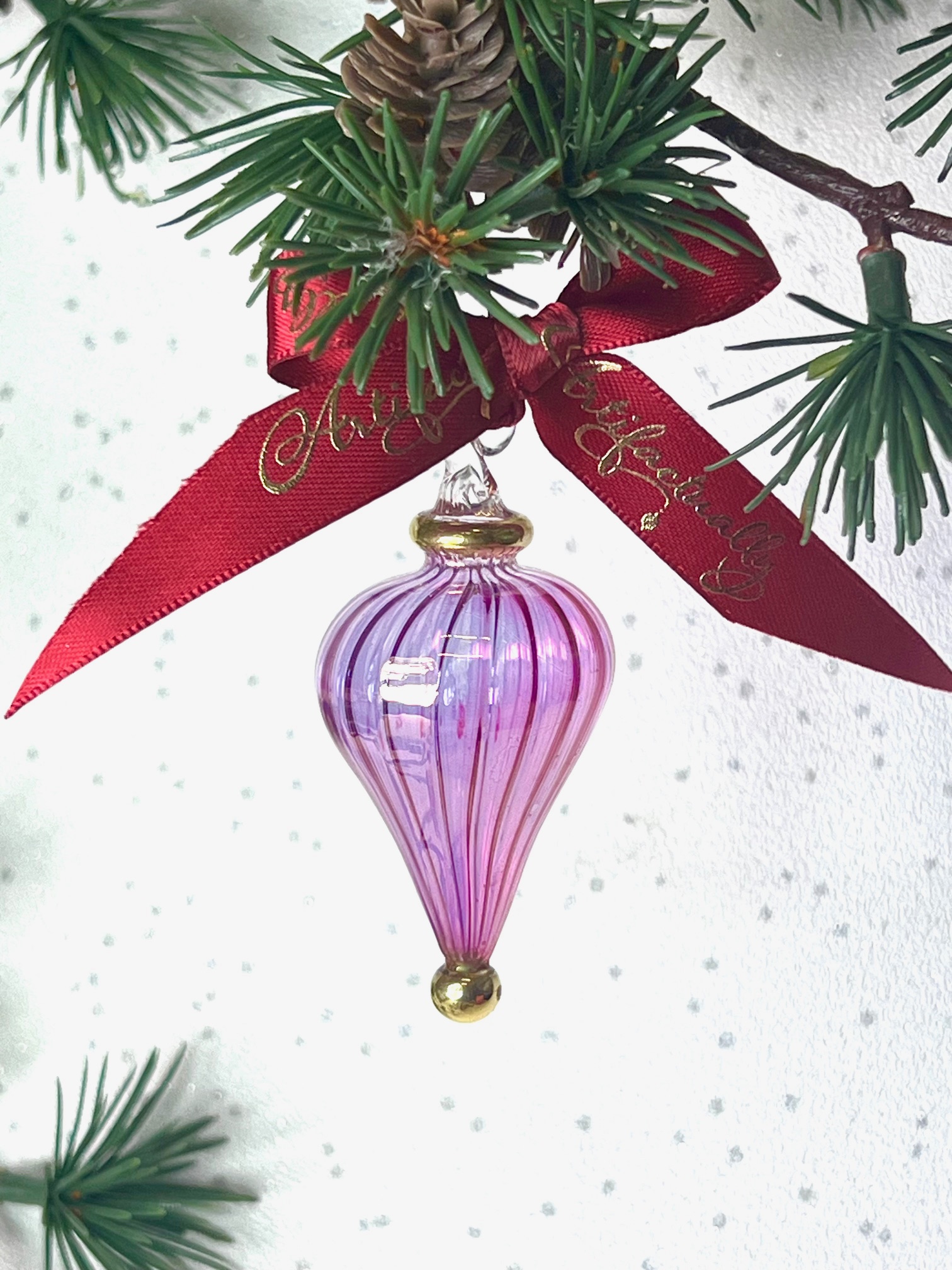 The hollow lined glass tube creates the stripy pattern in this lovely cone shaped bauble. Finished perfectly with gold trim and glass bobble at the very bottom. Size XS (3cm x 5cm)