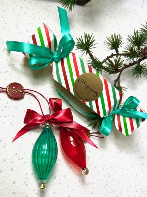This gorgeous handblown glass Oblong Ornament made from textured swirl glass in a cute stripy Christmas Cracker box will look sensational on your Christmas table this year. With a lovely ornament inside to trim the tree.